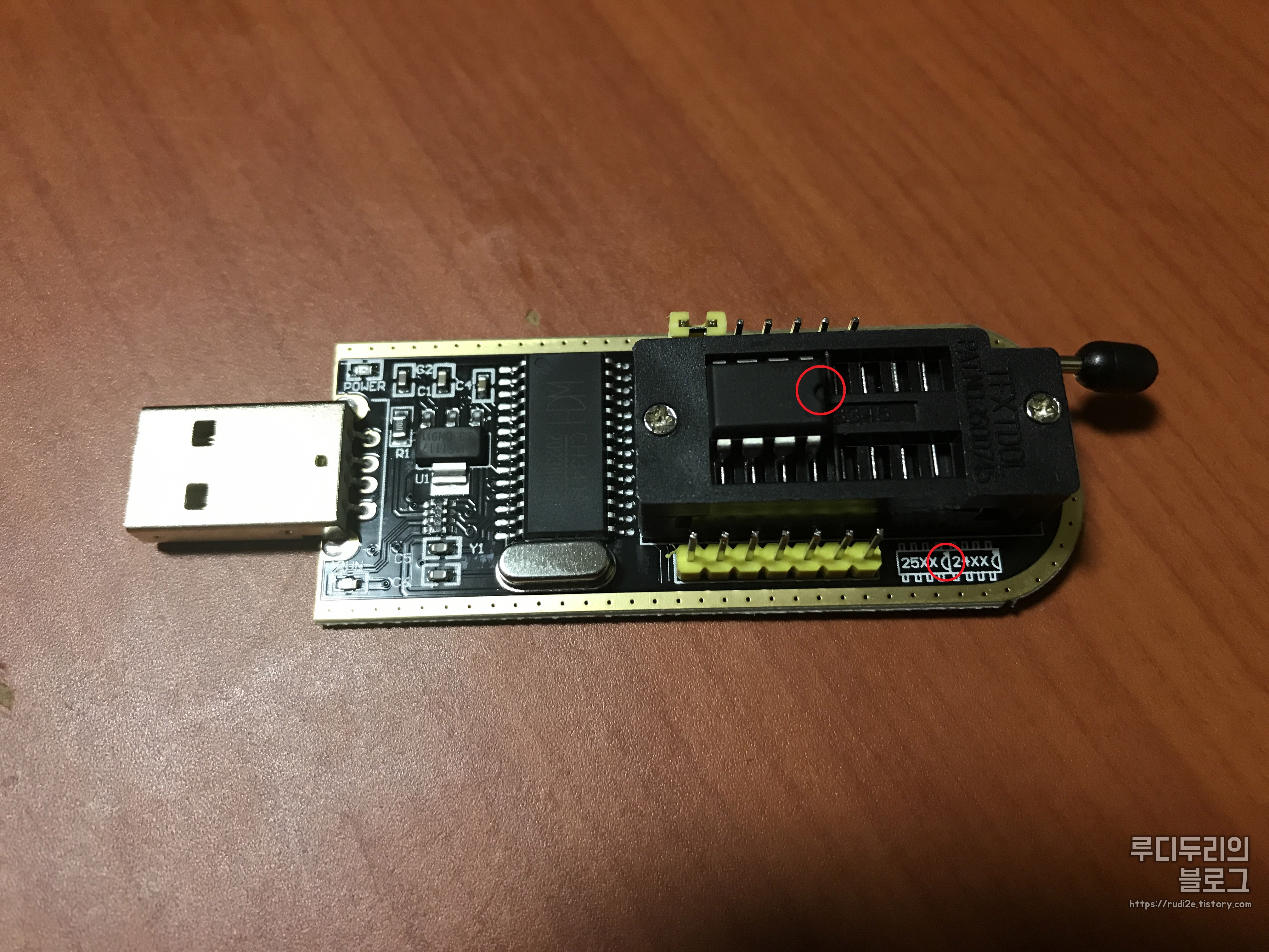 이 롬 라이터는 왼쪽에 25XX 계열 롬 (SPI BIOS), 오른쪽에 24XX 계열 롬 (EEPROM)을 연결할 수 있고